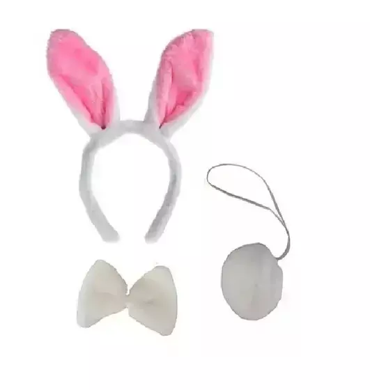 Esse kit de coelha traz tiara com orelhas, gravata borboleta e rabinho fofo, tudo em pelúcia macia e confortável.